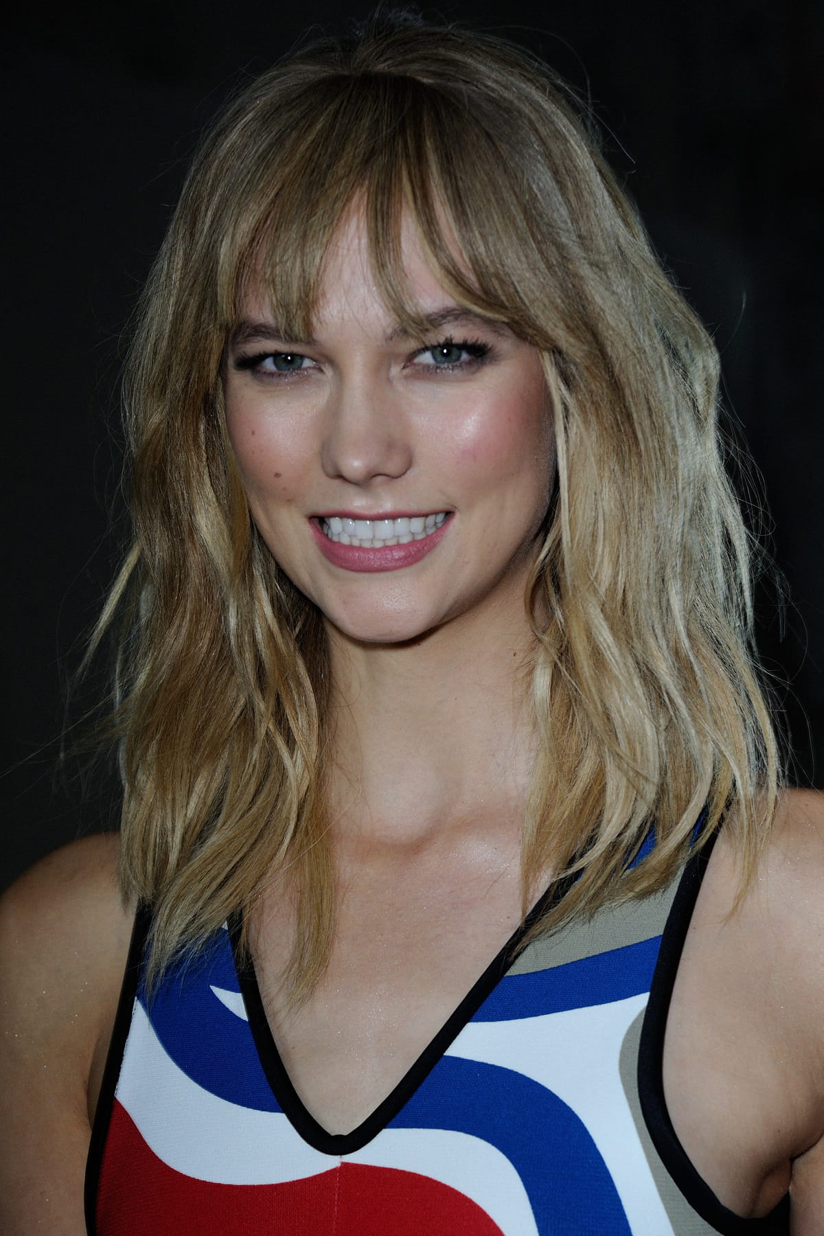 Coiffure ensoleillée garantie pour Karlie Kloss avec ces cheveux mi-longs coiffés avec un wavy naturel et une frange effilée.