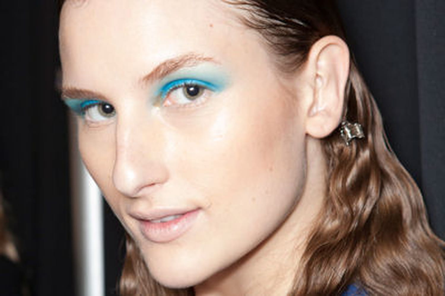 La plupart des détails du maquillage révèlent que Monique Lhuillier a succombé au charme du nude look. Le teint est clair, les pommettes sont sculptées avec un blush, la bouche est légèrement teintée et les sourcils sont naturels. Mais la créatrice brise les codes en optant pour un regard turquoise. Pour l'obtenir, on applique du fard à paupières cyan sur la paupière mobile. On intensifie la couleur à l'aide d'un crayon de la même couleur. On place une petite touche d'illuminant doré dans le coin interne de l'œil pour faire briller le regard.