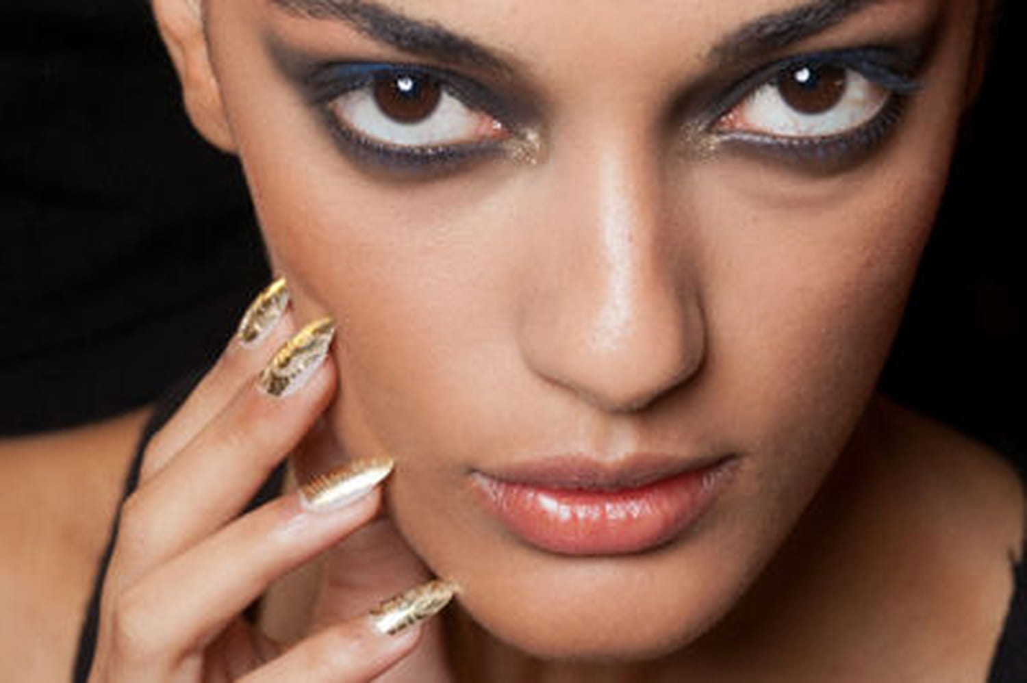 Le teint des mannequins est légèrement rehaussé et leurs pommettes sont sculptées avec une poudre bronzante. Leurs yeux sont abondamment travaillés pour créer un smoky métallisé. La palette employée inclut du bleu et du marron irisé. Du fard à paupières or est posé dans le coin interne de l'œil pour ajouter un point de lumière. Les cils sont allongés et volumisés avec un mascara. La bouche est naturelle et lumineuse. Pour finir le look, un détail qui tue : des ongles longs, dorés et décorés avec des motifs ton-sur-ton.