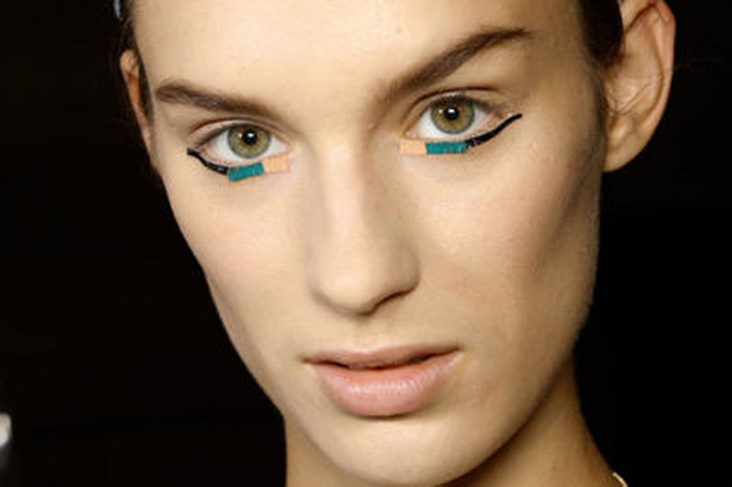 Tels que des artistes, les make-up artists de Fendi ont bien préparé leur base de travail. Le teint est clair et uniforme, comme une toile. Les bombés du visage sont à peine accentués par des touches de lumière. La couleur de la bouche est rehaussée par un rouge à lèvres neutre. La créativité artistique s'exprime au niveau des yeux. Un trait d'eye-liner est tracé au ras des cils supérieurs et allongés à l'infini avec du mascara. Des incrustations colorées (noires, jaunes, bleues, roses...) sont collées au ras des cils inférieurs pour remplacer le crayon noir classique. Les sourcils, eux, sont fournis mais bien définis pour structurer le regard.
