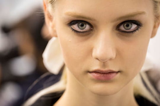 L'été prochain, le maquillage charbonneux sera toujours d'actualité. Chez Elie Saab, on opte pour un look mêlant les années 1960 et des détails orientaux. L'œil est entouré par une ligne d'ombre à paupières noire appliquée au pinceau. Le trait est plus appuyé sur la paupière mobile pour un regard profond. Les cils sont volumisés à l'aide d'un mascara. Le visage est unifié avec un fond de teint et une poudre. La bouche se pare d'un rouge à lèvres rose délicat. Les ongles sont habillés d'un vernis violet grisé chic et printanier.