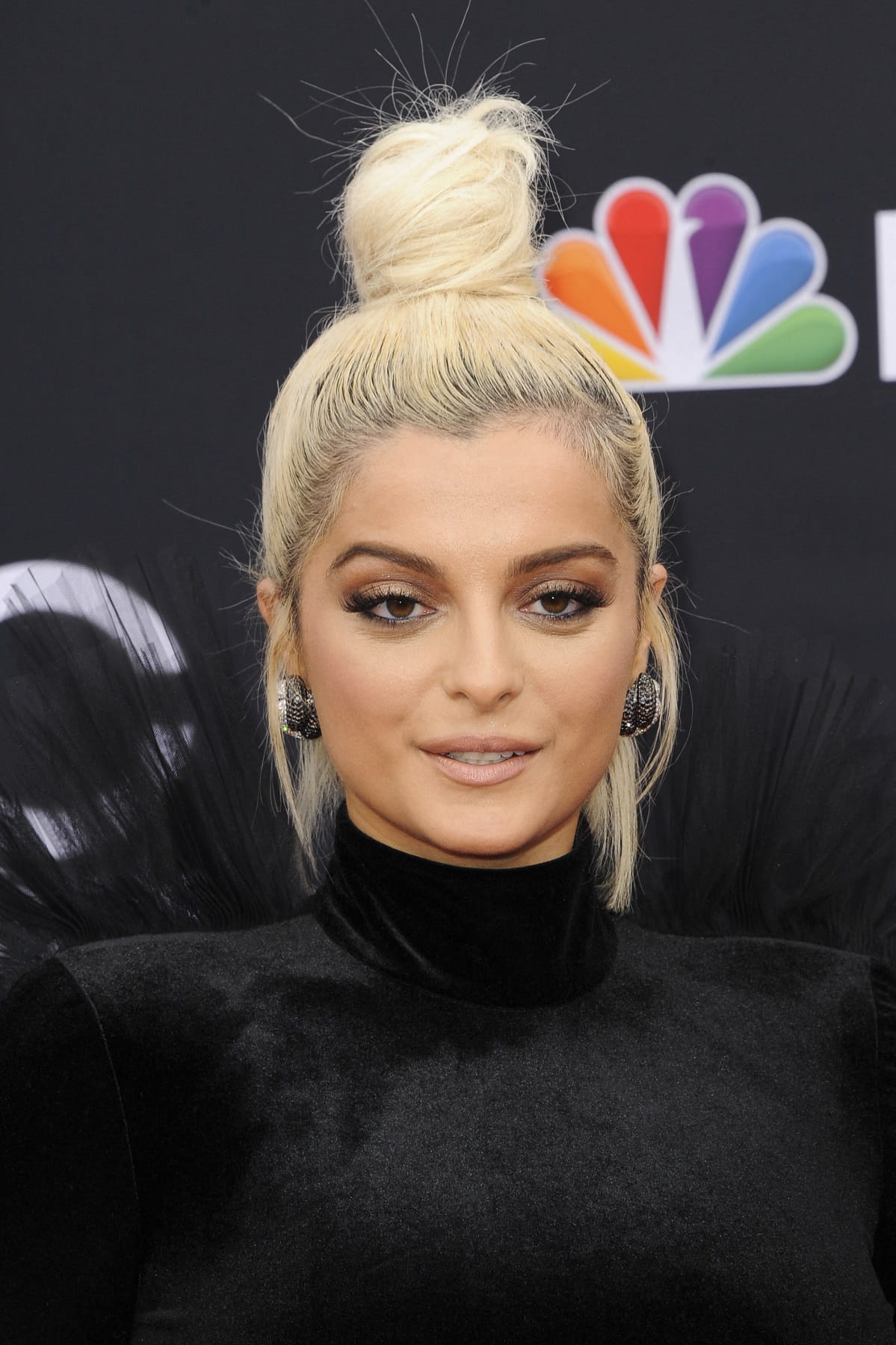 La chanteuse Bebe Rexha avait mis l'accent sur le maquillage de ses yeux et sur son chignon haut pour briller lors des Billboard Music Awards 2018.