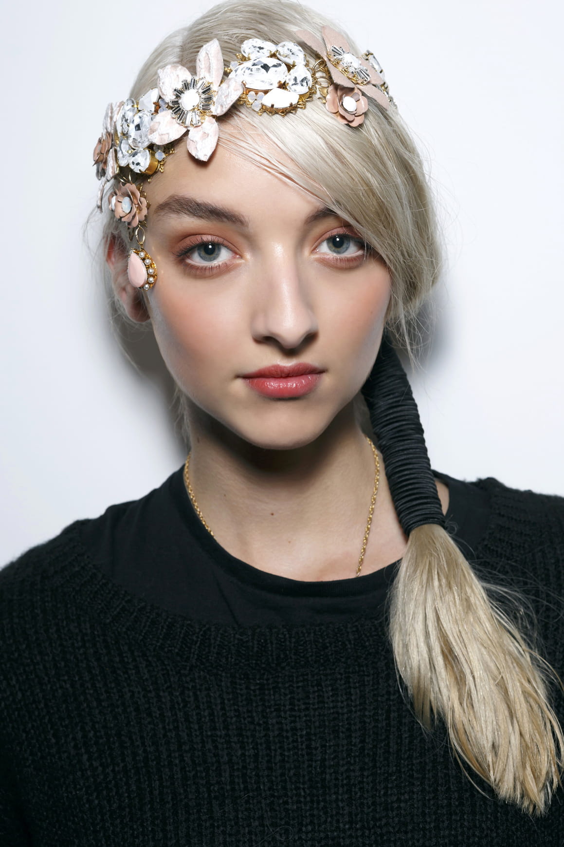 Chez Bora Aksu, le romantisme est empreint de modernité :  la chevelure est disciplinée par une queue de cheval enrubannée qui s'autorise l'accessoire avec un  headband-bijou floral.