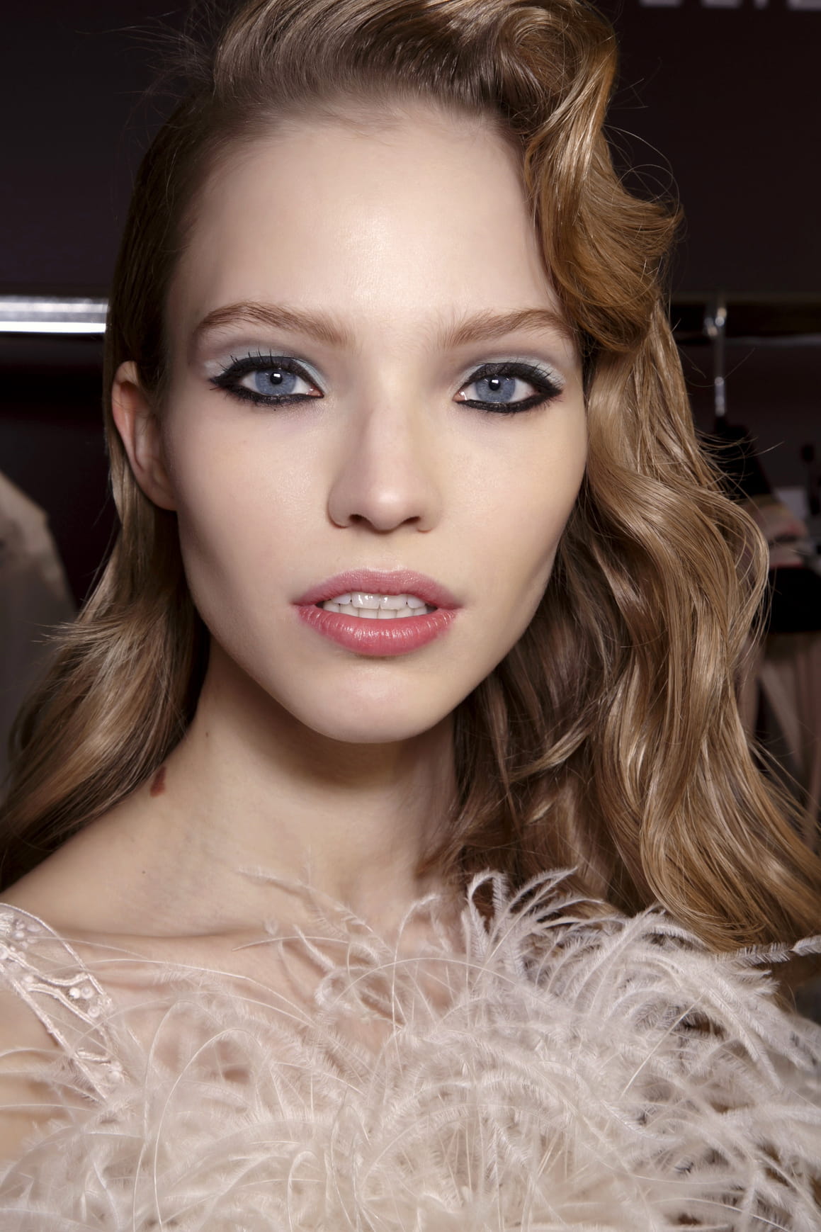 La simplicité est de mise pour ce coiffage subtil laissant retomber les longueurs ondulées en cascade sur un côté du visage.  La chevelure se veut libre de mouvement pour plus de sensualité.