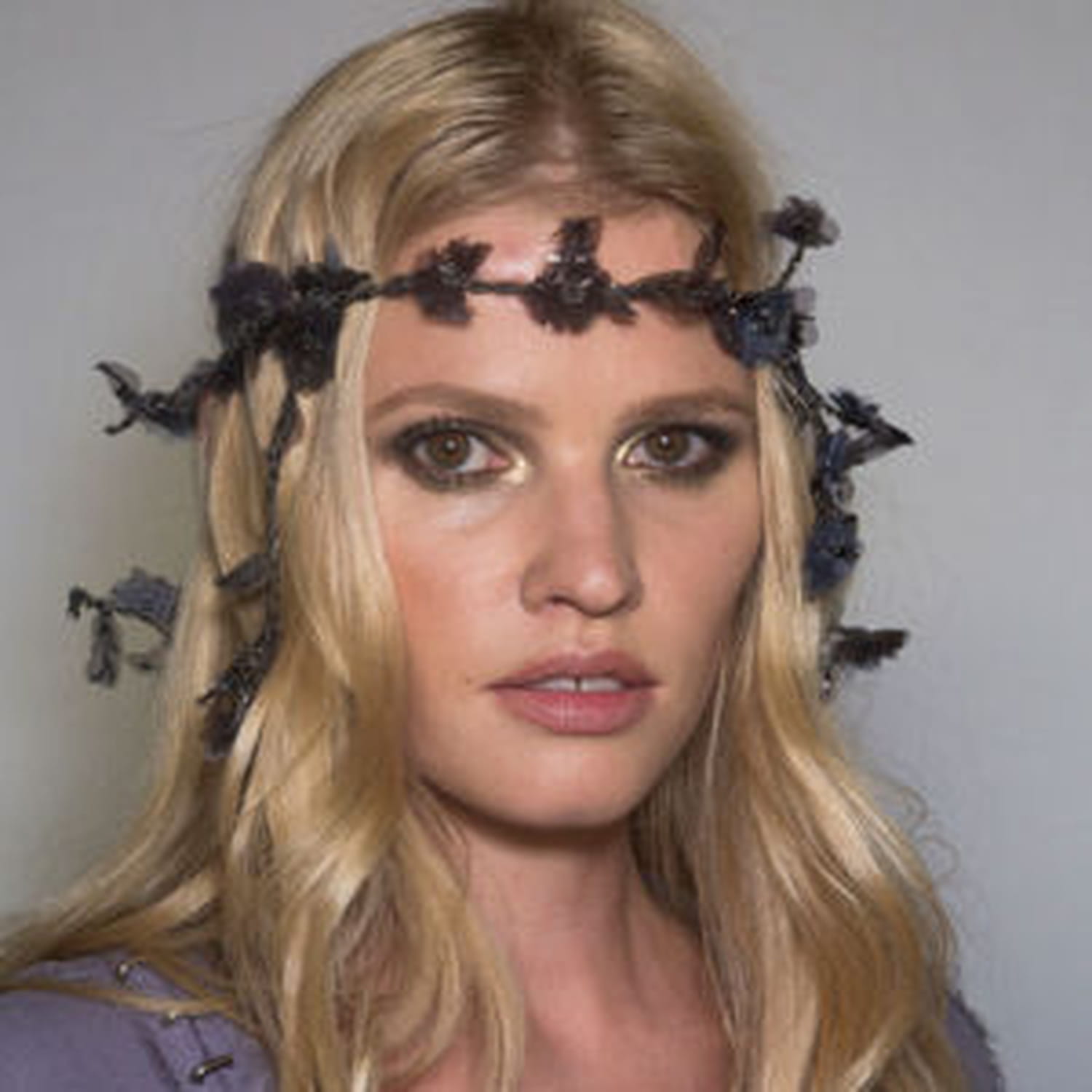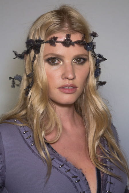La chevelure, grand atout féminin se porte lâchée. Après avoir été ondulées pour un effet wavy, les longueurs tombent avec nonchalance sur les épaules. Le look se dévoile bucolique à souhait grâce à la présence de fines couronnes de fleurs qui encadrent les jolies têtes des mannequins. L'accessoire se porte parfois bleu, parfois parme ou bordeaux pour s'associer sans aucune faute de goût aux créations de la maison. Le maquillage quant à lui met l'accent sur le regard. Il se dévoile sombre et lumineux à la fois comme les deux facettes de la personnalité de la femme Versace. On commence d'abord par appliquer en coin interne de l'oeil, un fard à paupières jaune doré puis on intensifie le reste du make-up avec un fard à paupières marron foncé et un trait de khôl brun appliqué en muqueuse. Le teint, légèrement unifié, se porte des plus naturels tandis que la bouche se trouve subtilement rehaussée d'un rouge à lèvres nude.