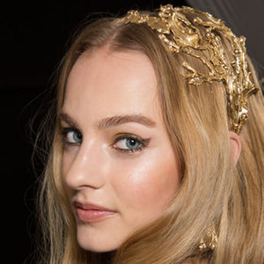Sublimes et arborant d’élégants headbands dorés, les tops se succèdent tantôt déesses tantôt princesses. Bijou de tête, le headband orne la chevelure tout en raffinement, mimant un entremêlement subtil de branchages et de feuilles d’or qui participe du faste de cette collection où l’or est roi. D’une féminité exacerbée, la chevelure est soyeuse et s’épanouie en mouvements naturels, en parfaite harmonie avec la sensualité du vêtement qui se la joue dentelle de peau sublimant les courbes de la femme en transparence. Pour parfaire ce coiffage enchanteur, le maquillage reprend les codes de la collection couture en fardant la paupière d’un or affirmé et en rehaussant le teint d’un blush pêche qui réveille la carnation originelle de la peau. Le regard gagne en intensité grâce à un eyeliner marron qui dessine aux mannequins de vrais yeux de chat charmeurs alors que le nude s’invite sur les lèvres de manière ravissante. C’est tout un monde qui naît sur le podium le temps d’une parenthèse enchantée.