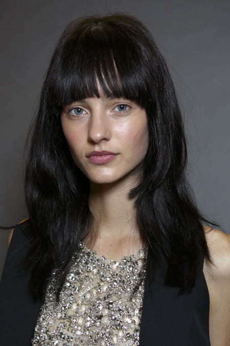 Pour contraster, le make-up artist mise sur un look beauté naturel presque imperceptible qui sublime la femme sans en faire trop. L'attention est portée sur le teint qui se dévoile lumineux à souhait. Les imperfections sont lissées, camouflées à l'aide d'un fond de teint léger et les cernes sont atténués grâce à un voile de correcteur. L'arête du nez, l'arc du cupidon et les pommettes apparaissent à peine scintillantes. Le teint est éclatant, en bonne santé ! La coiffure quant à elle, a un sacré caractère. La frange est plus que jamais tendance et s'affiche épaisse et longue pour souligner le regard. Une épaisseur et un volume certain que l'on retrouve sur l'ensemble de la chevelure. Sublime !