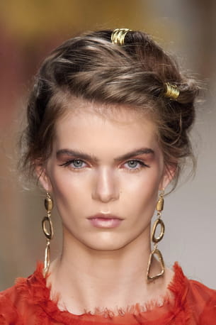 Chez Alberta Ferretti le chignon est agrémenté de torsade glissées dans des anneaux dorés. Le comble du chic.