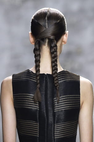 Chez Sally LaPointe, on ne plaisante pas avec les tresses. Ultra lisses, elles se croisent sans encombre pour créer deux couettes parfaitement symétriques. Net et sans bavure.
