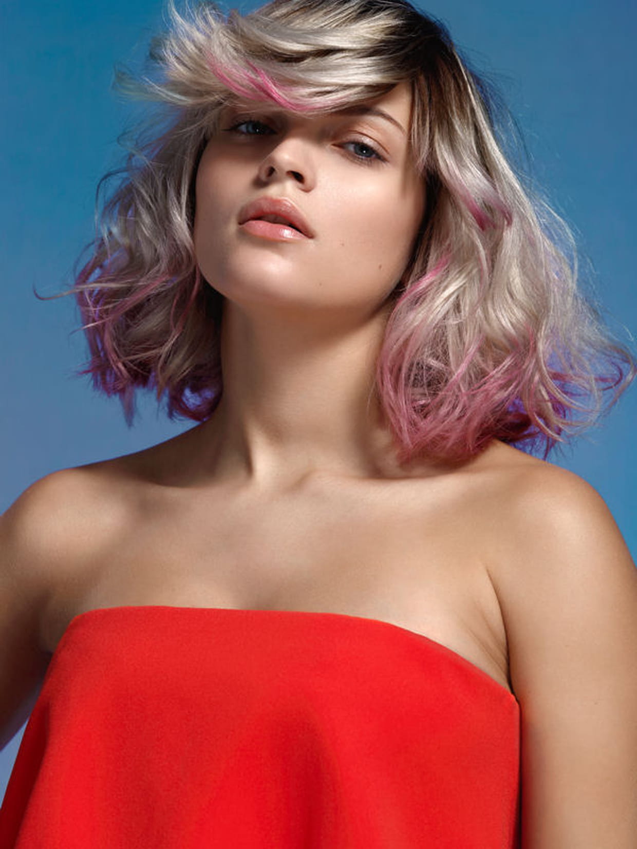 Cette coupe au carré avec mèche épaisse met parfaitement en relief les nuances de la coloration rose pastel. Une tendance forte de la saison.