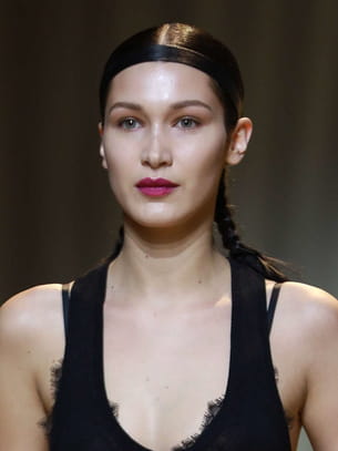 Bella Hadid mise sur un headband en cuir pour accessoiriser ses nattes très sages. Chez H&M, on le porte noir pour un total look black.