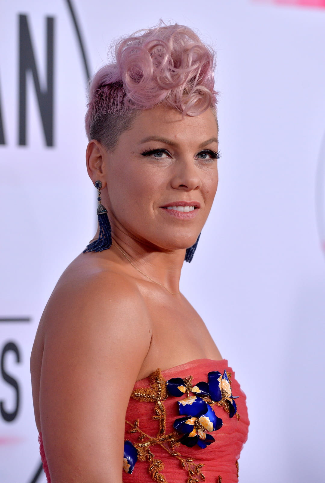 Vêtue d'une jolie robe corail, Pink a tout misé sur le regard. Pour accompagner son teint frais et léger, la chanteuse a opté pour un épais trait d'eye-liner noir et une paire de faux-cils volumineux. Exit le rouge à lèvres, la compagne de Carey Hart préfère sa bouche au naturel. En revanche, côté coiffure, c'est une véritable explosion de couleur, une coupe pixie bouclée rose pastel qui lui va à ravir.