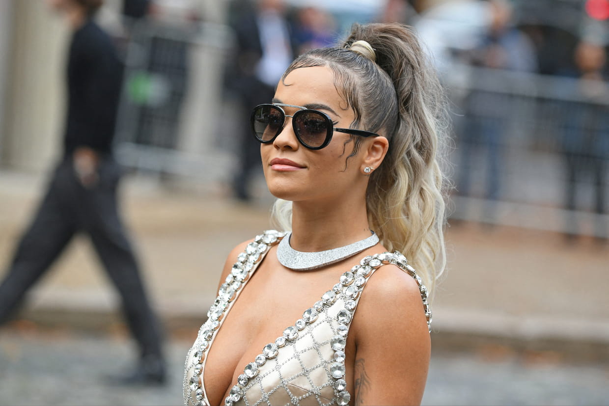 Rita Ora avec un mini chouchou beige sur une queue-de-cheval haute