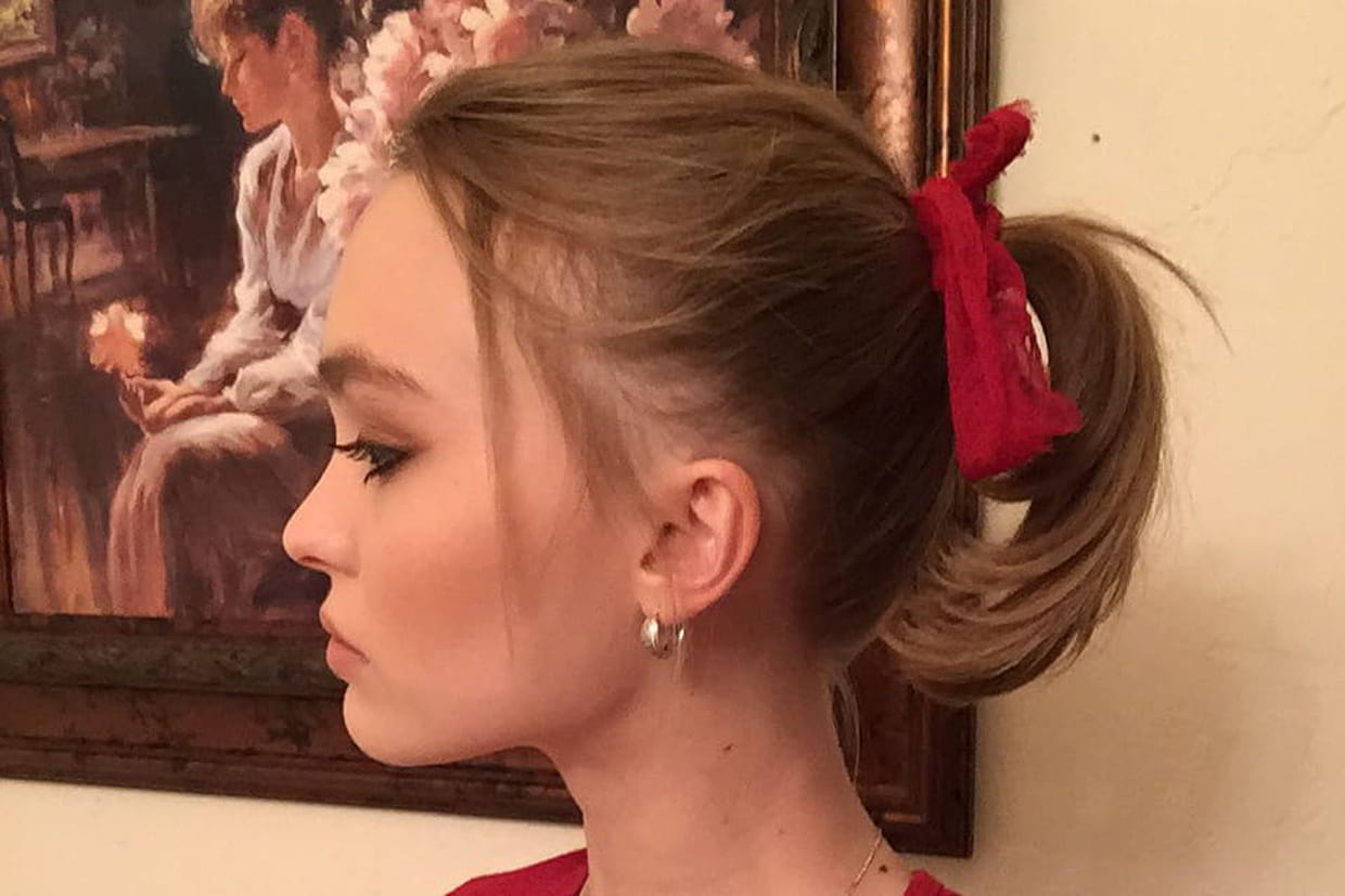 Lily-Rose Depp avec un chouchou à ruban rouge sur une queue-de-cheval