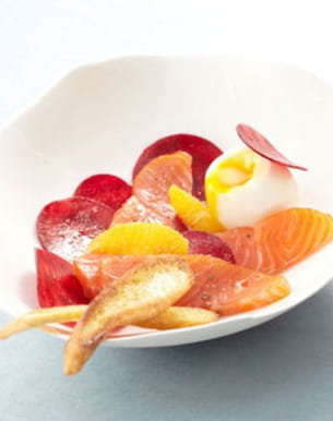Cœur de saumon de Norvège fumé, œuf mollet et betteraves à l'orange
