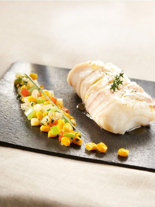 Dos de cabillaud à la vapeur et ratatouille de maïs