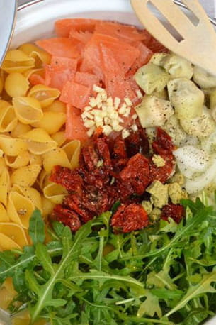 One pot pasta au saumon fumé, tomates séchées et roquette