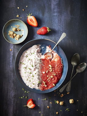 Flan de chia au yaourt à la fraise et compote de fraise-rhubarbe