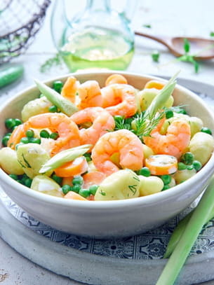 Crevettes, gnocchi, petit pois et gingembre