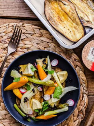 Aubergine confite à l'huile d'olive et légumes à la grecque