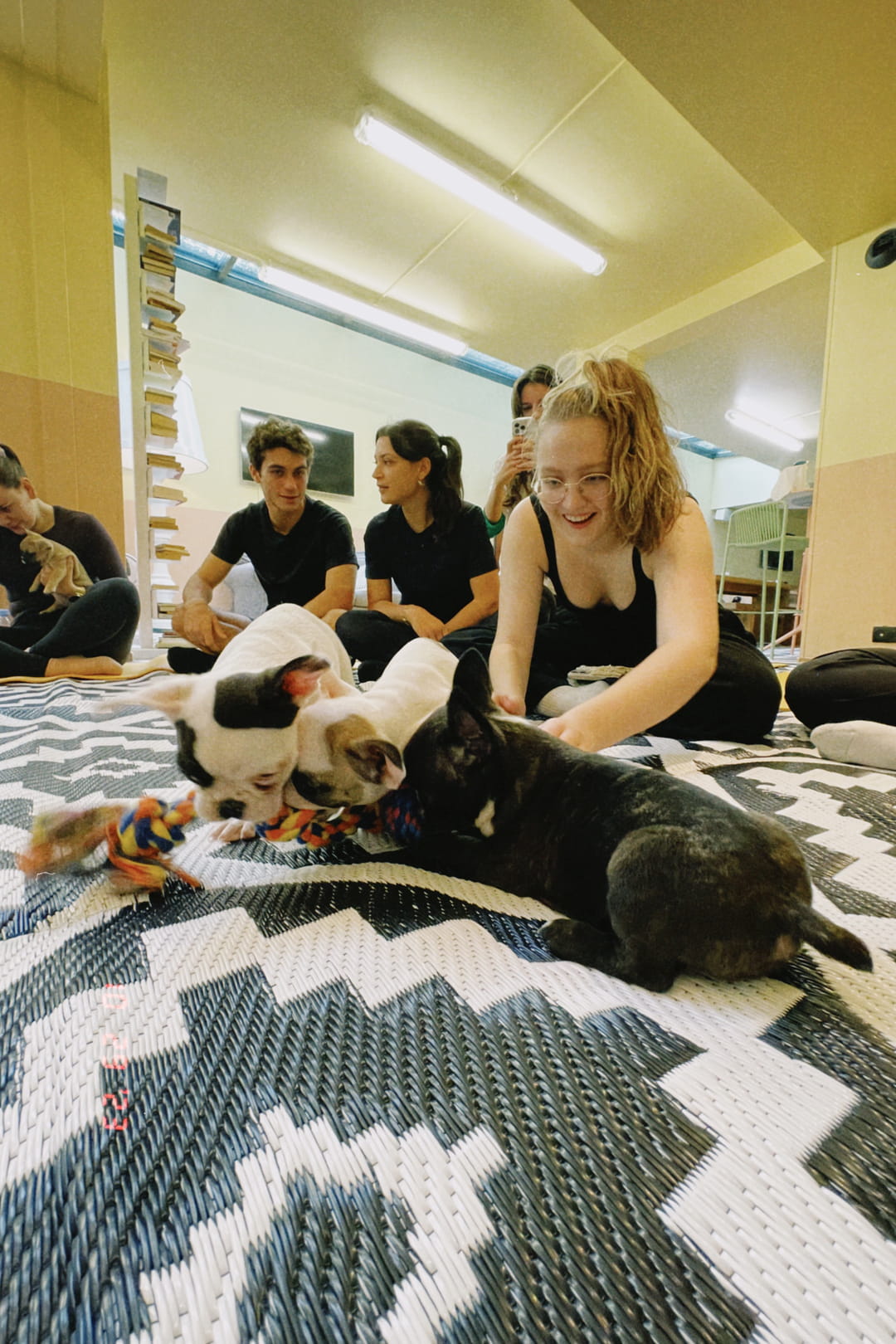 Contrairement aux sessions de puppy yoga dites classiques, pratiquées aux États-Unis, celles proposées ici se déroulent en deux temps - et plus de trois mouvements - et les chiots ne rejoignent les participants qu'après l'effort. Notre professeure du jour, Giulia Giordano, dispense un vrai cours de yoga, adapté aux débutants comme aux plus confirmés, et ce, trente minutes durant. Les postures s'enchaînent - chien tête en bas, salutation au soleil, cygne endormi - et les muscles commencent à bien chauffer. Pendant le cours, les chiots se reposent pour mieux profiter de l'attention qui leur sera portée ensuite. L'apaisement se fait, puis nous sommes invités à former un cercle bien serré, afin que nos compagnons à quatre pattes du jour ne se fassent pas la malle.