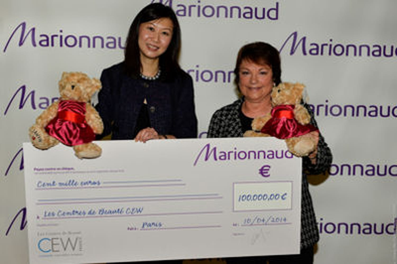 Eileen Yeo, Directrice Générale de Marionnaud France a remis le chèque à Françoise Montenay, Présidente des Centre de Beauté de CEW France à l'hôpital Saint-Louis à Paris. La vente des oursons ( 9,90 euros l'unité) habillés par Lanvin au moment de la Saint Valentin, a remporté un grand succès.