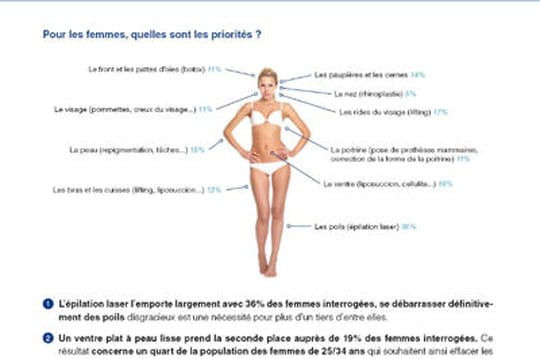 Ennemi juré des femmes, les poils arrivent largement en tête. S'en débarrasser définitivement avec l'épilation laser est une nécessité pour 36 % d'entre elles. En deuxième position, nous retrouvons le ventre plat et la peau lisse. Le recours à la liposuccion est le remède pour 19 % des femmes interrogées qui souhaitent effacer la cellulite, excès de graisse et les marques de grossesse (pour 25 % des femmes âgées de 25 à 34 ans).