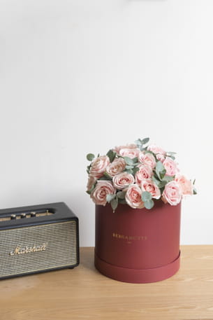Un bouquet dans une boîte à chapeau chez Bergamotte