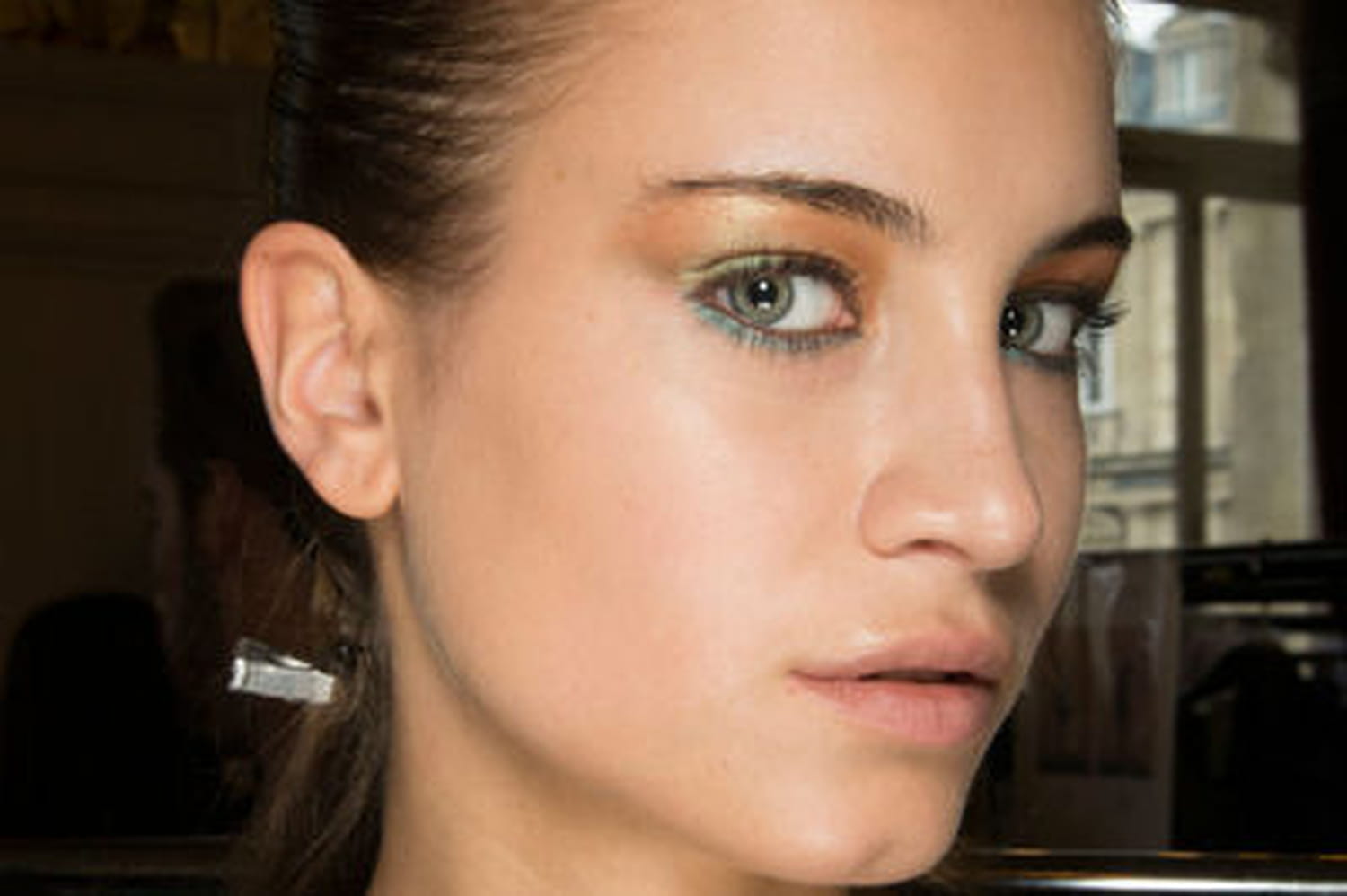 Tout comme les silhouettes le maquillage repéré sur le podium de la créatrice attire le regard. Les yeux se parent d'un trio de couleurs : turquoise sur la ligne inférieure des cils, vert menthe utilisé en eye liner et cuivre sur tout la paupière. Un mélange qui donne un make-up structuré, glamour tout en restant moderne. Qui n'est pas sans rappeler les teintes maîtresses de la collection. Une palette également très estivale qui conviendra à la perfection à tous les papillons de nuit.