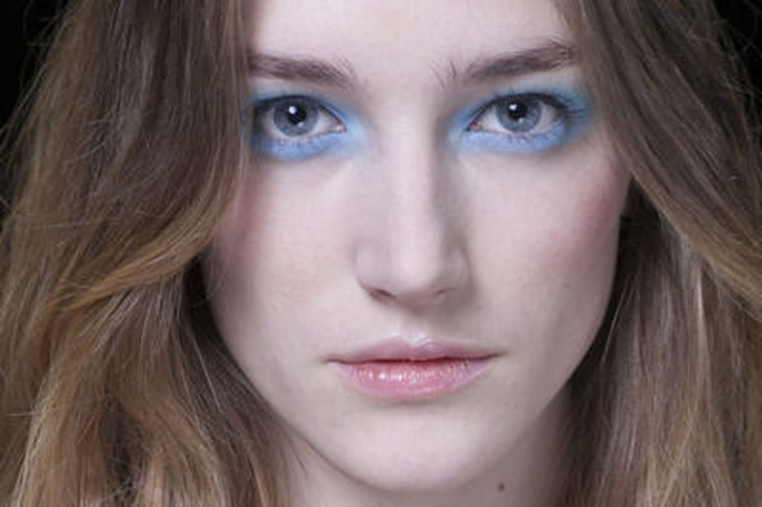 Un très joli fard à paupières bleu est appliqué sur l'ensemble de la paupière. Ce maquillage étiré jusqu'aux tempes et pratiquement au niveau de l'arrête du nez entoure l'œil d'une couleur pastel et estivale. Le rendu tel un masque léger illumine le visage pour un effet moderne.