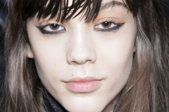 Pour le tracé, on utilise un crayon khôl noir gras qu'on intensifie au coin interne de l'œil et qu'on étire jusqu'au coin externe. Pour accentuer l'effet charbonneux, le trait de crayon doit être estompé. Le teint est également un élément important du maquillage puisqu'il apparaît diaphane et sans aucun défaut. Il est lumineux sur la zone T. La bouche reste naturelle. Les ongles se parent d'un vernis noir brillant. Une tendance à adopter uniquement sur ongles courts pour éviter le look gothique. Pour la coiffure, on mise sur les cheveux lâchés et la raie sur le côté.