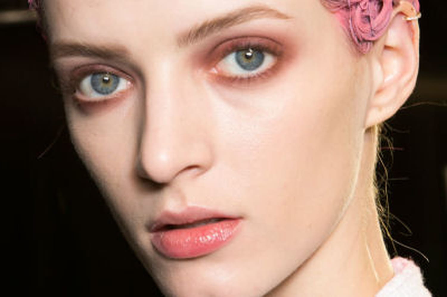 Le regard de la femme Givenchy s'avère bel et bien hypnotisant. La teinte appliquée sur la bouche rappelle celle des paupières pour un équilibre parfait. Le gloss rosé est appliqué au centre des lèvres pour un effet scintillant. Mais la palme de ce look ravissant revient sans hésiter à la coiffure qui apparait ornée de roses. Mèche par mèche, les cheveux sont enroulés et plaqués sur la tête sous la forme de dizaine de roses. La maison Givenchy a misé également sur une coloration de la chevelure en rouge, rose, bleu ou violet pour une mise en beauté sensible, presque onirique.