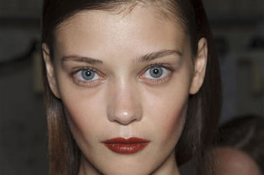 Chez Helmut Lang, la mode est aux robes graphiques et à la couleur carmin. Le créateur s'amuse autour de la couleur de la passion et joue sur un effet rétro avec des robes longues et amples aux motifs graphiques. Les lèvres se font belles et charnelles en prenant un coloris rouge foncé. Les traits de la bouche sont donc bien appuyés et mis en valeur par un maquillage intense et précis. Les joues s'accordent à cette mise en beauté en s'habillant d'un simple coup de pinceau de blush rouge. Le reste du maquillage est très nude. Le regard s'ouvre et s'agrandit d'un coup de mascara. Et le visage est simplement couvert d'un fond de teint illuminateur transparent.