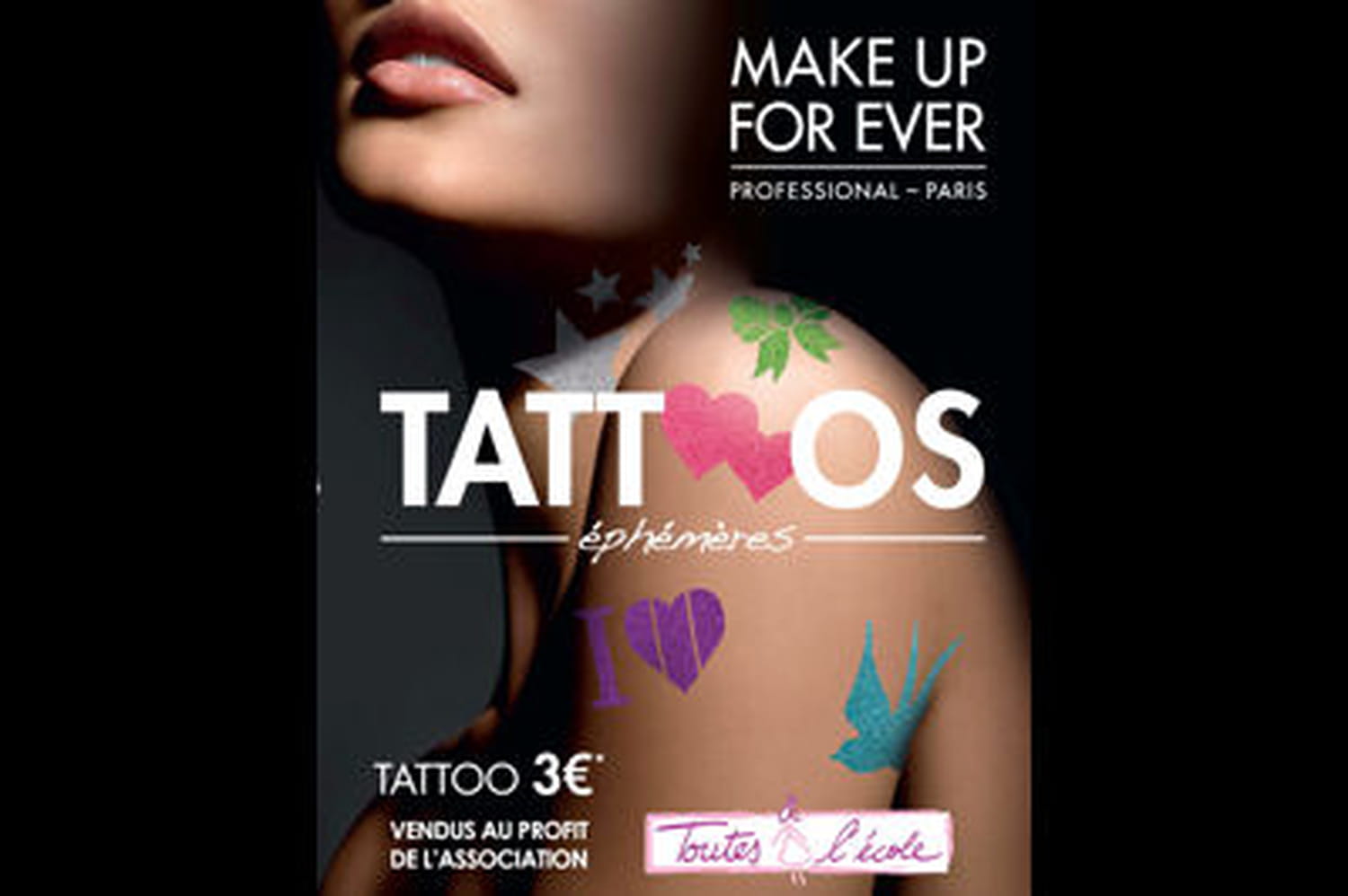 Parce que Make Up Forever est une entreprise engagée auprès des femmes, cette année, c'est avec l'association "Toutes à l'école" qu'elle s'associe en vue de récolter des fonds en faveur de l'éducation des femmes. Depuis le premier juillet et ce jusqu'à fin aout, la marque de cosmétique créée par Dany Sanz il y a trente ans maintenant, propose dans tous les magasins Sephora la pose de tatouages éphémères. Pour cela, 50 000 pochoirs et six modèles différents ont été développés spécialement pour l'occasion. Ces tatouages s'inscrivent dans la gamme Waterproof Aqua, qui contient des produits de maquillage longue tenue, imperméables et aux couleurs tendances. Au prix de trois euros la pose, l'intégralité des fonds récoltés sera reversée à cette association.
