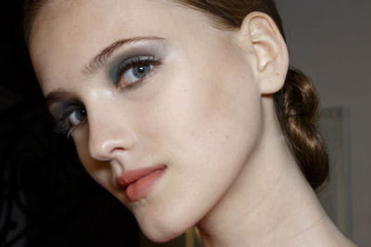 Pour le beauty look, on retrouve cette même douceur. L'élégance est de mise. Le teint est travaillé avec un souci de légèreté. Des points de lumières apparaissent sur les pommettes, l'arête du nez et l'arc de Cupidon. Un smoky réalisé avec un fard gris iridescent illumine la paupière avec justesse. La bouche reste discrète mais se fait néanmoins gourmande grâce à rouge à lèvres mat couleur pêche.