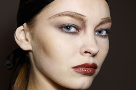 Le teint est lumineux mais joue avec les ombres avec un blush marron doré sur les pommettes. On craque pour rouge à lèvres rouge sang mat qui accentue ce maquillage mystérieux et sombre.