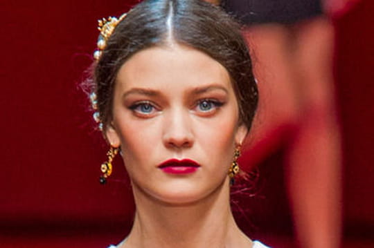 C'est une femme dans toute sa splendeur que présente à nos yeux la maison Dolce & Gabbana. Le défilé pour la collection printemps-été 2015, annonce la couleur. Il faut être coquette et afficher un réel plaisir à se maquiller. La silhouette est féline et séductrice, alliée à une fausse retenue apparente. Il est important de connaître ses atouts et de les souligner avec subtilité. Jamais femme fatale, on se doit d'adopter une allure attrayante et pleine de mystère. Les yeux sont travaillés avec un fard à paupières irisé, appliqué sur tout le contour de l'œil. Le regard est mis en valeur de sorte qu'il dégage plus d'intensité. Un effet obtenu avec un mascara appliqué de façon légère, qui démarque les cils avec naturel. La fantaisie make-up, réside dans le dessin créé par un trait d'eyeliner qui commence à la fin de l'œil. Son objectif ? Agrandir le regard et adopter une forme amande pour donner un style animal. Le rouge à lèvres se préfère couleur framboise plutôt que rouge car il est moins agressif au teint. Il a la qualité de prononcer les lèvres d'une touche charnelle et fruitée avec fraîcheur. Tandis que les pommettes se parent d'un blush rosé qui permet d'accentuer le relief du visage. Côté cheveux, la coiffure est sobre et délicate. Le mieux est d'opter pour un chignon bas avec une raie au milieu. La chevelure recouvre subtilement les oreilles et s'habille d'un accessoire au style baroque. Le secret est révélé à vous de l'emprunter !