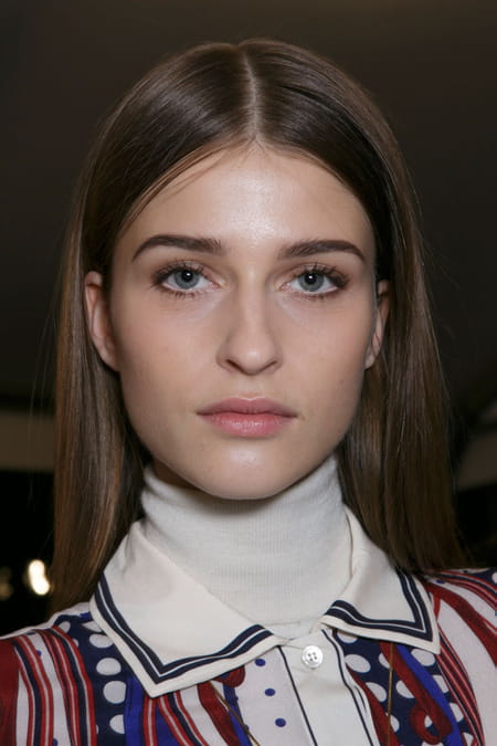Côté beauty look, on craque à 100 % pour ce maquillage discret et portable au quotidien. Oublié le make-up inimitable ! Avec cette mise en beauté, Tommy Hilfiger s’adresse à toutes les femmes. Étape importante et plus encore en hiver : le maquillage du teint. Après l’avoir unifié à l’aide d’une BB crème légère, on balaye le visage d’une poudre matifiante mais lumineuse. Sobre mais efficace, le regard se fait envoûtant grâce à un fard à paupières marron aux reflets gris. Il est disposé en aplat sur la paupière mobile ainsi qu’au ras des cils inférieurs. Pour apporter de la fraîcheur, le crayon nude en muqueuse et le mascara allongeant sont deux de nos indispensables. Les sourcils, disciplinés grâce à un gel fixant, se portent plutôt épais afin d’afficher un regard audacieux. À l'image de la totalité du look, le créateur américain mise sur une coiffure sage mais qui fait tout de même son petit effet. La raie au milieu quant à elle, ne laisse que peu de place à l'originalité. À vous de jouer !