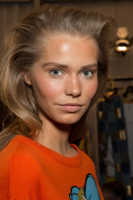 Le défilé Moschino porté par Jeremy Schott a encore dévoilé une collection extravagante et divertissante. Malgré la fraîcheur de l’hiver, la femme Moschino osera les couleurs très vitaminées et les motifs enfantins. Les Looney Tunes sont notamment à l’honneur avec Porky Pig sur une robe-pull ou Daffy Duck sur un maillot de base-ball. Aussi surprenant que cela puisse paraître, le tout reste sexy ! Pour accompagner cette ligne drôle et amusante, on découvre un beauty look discret mais toujours un brin décalé. Comme à Londres ou New York, le nude domine. Le regard n’apparaît pas maquillé si ce n’est avec le tracé d’un crayon beige dans la muqueuse. La bouche est mise en valeur avec un gloss nude et brillant qui habille subtilement les lèvres. La singularité du look ? Le travail du teint, solaire et estival. La mine est réchauffée, presque bronzée grâce à l’application d’une poudre de soleil et d’un blush rosé. Le premier est utilisé sur l’ensemble du visage tandis que le second colore les pommettes. À l’image du make-up, la coiffure est légère, comme lors d'une balade à la plage. Au gré du souffle du vent, la chevelure s’agite et se positionne en arrière pour un résultat tout en volume.