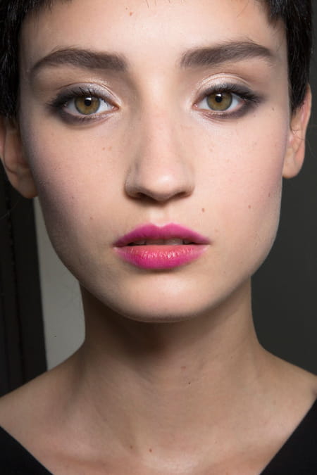 En parfaite harmonie avec le vêtement, le maquillage impose son élégance et son attitude un brin irrévérencieuse entre regard fumé et bouche colorée. Sur un teint naturel et légèrement poudré, la paupière gagne en éclat grâce à un fard nude subtilement irisé alors qu’au ras des cils le noir s’invite en un trait d’eyeliner fumé qui s’étire dans le coin externe de l’œil et joue les prolongations pour souligner le regard. Le make-up gagne ainsi ses lettres de rock attitude, parfait par une bouche matte rose fuchsia terriblement féminine. Audacieuse, la femme Armani arbore une perruque ébène ultra courte et n’hésite pas à mélanger les matières comme elle se joue des textures par sa mise en beauté : plumes, velours et tissus subtilement métalliques lui font échos pour notre plus grand plaisir. Alors que les mannequins défilent, bientôt le bleu, le violet et le vert prennent le relais du rose, toujours guidés par ce maquillage de Lady rock irrésistible.