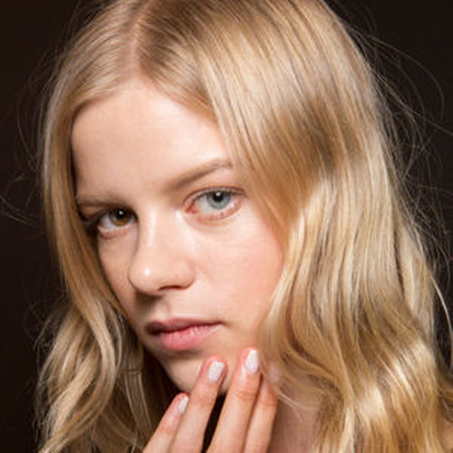 La mise en beauté du show fait écho aux pièces avec un look très naturel. Le nude s'impose donc avec un teint travaillé tout en légèreté mais avec une pointe de glowy sur les tempes, l'arête du nez et les pommettes. Les yeux brillent grâce à un anti-cernes sur l'ensemble du contour de l'oeil et gagnent en intensité avec une touche de mascara appliquée seulement sur les cils supérieurs. Les sourcils sont brossés et redessinés avec un crayon d'une teinte se rapprochant au maximum de la couleur naturelle. La bouche est poudrée et parée d'un rouge à lèvres nude à peine brillant.