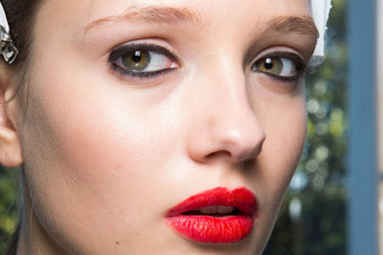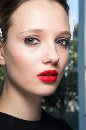 Le look beauté joue également le jeu de la séduction. Les yeux ou la bouche ? Pourquoi choisir ? Les deux sont mis en valeur sans se faire de concurrence. Et c'est précisément là que réside la réussite de ce maquillage de défilé. Commençons par les yeux. Le contour de l'oeil est redessiné avec un crayon ultra noir qui révèle la pupille et apporte une touche de mystère. Pas de mascara à l'horizon, le khôl se suffisant largement à lui-même. La bouche, elle, se démarque avec un rouge vif légèrement brillant. Les lèvres sont gourmandes et incroyablement sexy. Pour que le résultat soit parfait, le teint est lumineux et travaillé avec un fond de teint qui laisse un fini naturel. Pas de blush trop voyant. Simplement une touche de poudre de soleil dans le creux des joues pour sculpter le visage.