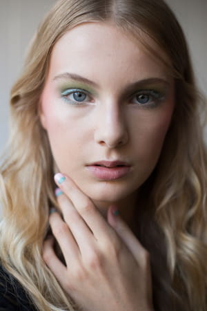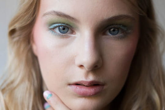 Le make-up reprend les couleurs des silhouettes du défilé. Un fard bleu aquatique est appliqué sur la paupière mobile et à la racine des cils inférieurs. Un vert menthe à l'eau habille le reste de la paupière sans la surcharger. Le make-up artist a pris le parti de ne pas mettre de mascara pour laisser toute sa place à la couleur. Le teint est lumineux et rehaussé d'une touche de blush rose travaillé sur les tempes.
