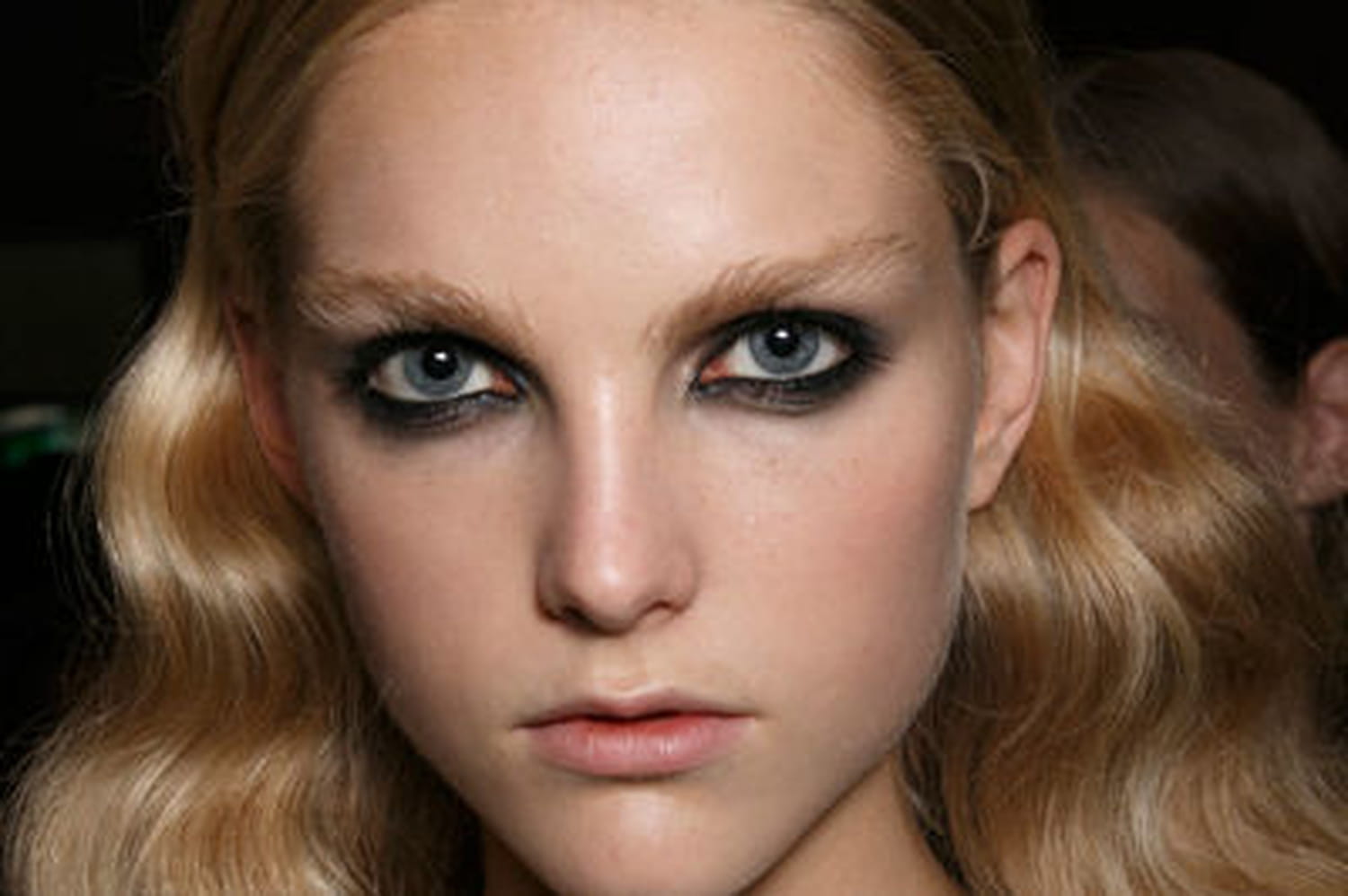 La mise en beauté du défilé est élégant et dans l'air du temps. Le mystère est de mise avec un smoky eye noir qui redessine le contour de l'oeil avec justesse. La couleur est appliquée sur la paupière mobile et sous les cils inférieurs. Un trait de khôl noir s'immisce sur la ligne de la muqueuse pour intensifier encore un peu plus le maquillage des yeux. Le mascara noir, indispensable, étoffe les cils et ajoute une dimension "drama" au smoky. Le teint est travaillé avec légèreté. Seul un nuage de blush rosé vient adoucir les pommettes. La bouche est nue et se confond presque avec la peau.