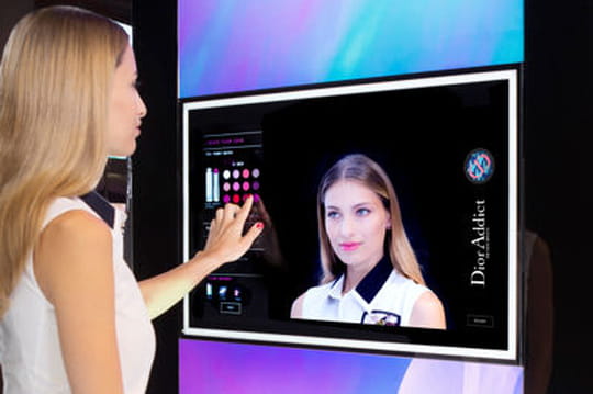 Dior propose de tester virtuellement ses produits grâce à un simulateur de maquillage virtuel sur grand écran.