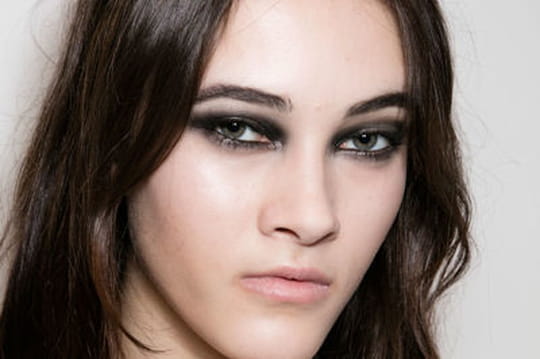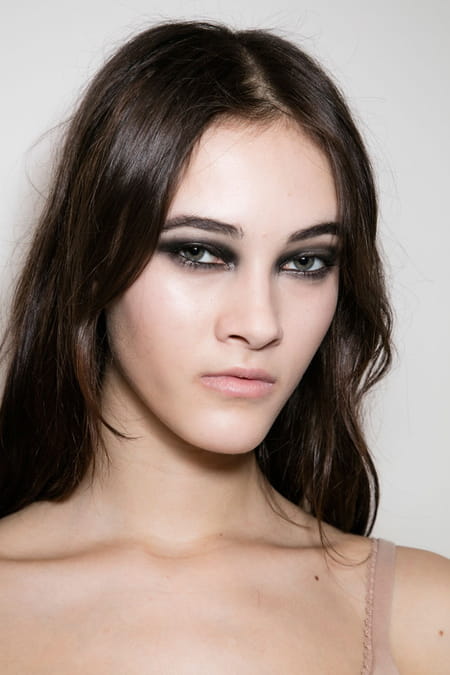 Le look beauté fait écho avec justesse aux créations glamour de la marque italienne. Le teint est lumineux. Travaillé avec légèreté, il est uniforme et mat. Il se fond presque avec la bouche très légèrement brillante sous l'effet d'un baume hydratant. Séductrice assumée, la femme Versace hypnotise d'un seul regard. Les yeux se dévoilent avec glamour derrière un smoky noir étiré vers le coin externe de l'oeil. Des pointes de lumière apparaissent sur le coin interne et sous la ligne des ras de cils inférieurs grâce à un fard doré iridescent. Les sourcils sont structurés au crayon pour encore plus d'intensité. Un khôl noir s'imisce dans la muqueuse et donne de la profondeur au maquillage des yeux. Une pointe de mascara, noir également, allonge les cils sans exagération afin de laisser planer le mystère.