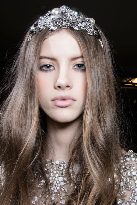 La coiffure fait écho aux silhouettes fluides et voluptueuses.Les longueurs libres, légèrement ondulées et froissées aux doigts retombent savamment sur la poitrine. Un bijou de tête massif orne les cheveux et apporte toute sa majesté à la coiffure. Les influences de cet accessoire de cheveux restent floues. Mais ce serre-tête précieux complète à la perfection les créations du libanais. Encore une fois, Elie Saab nous transporte dans un monde raffiné dans lequel les femmes sont des princesses fortes et modernes.
