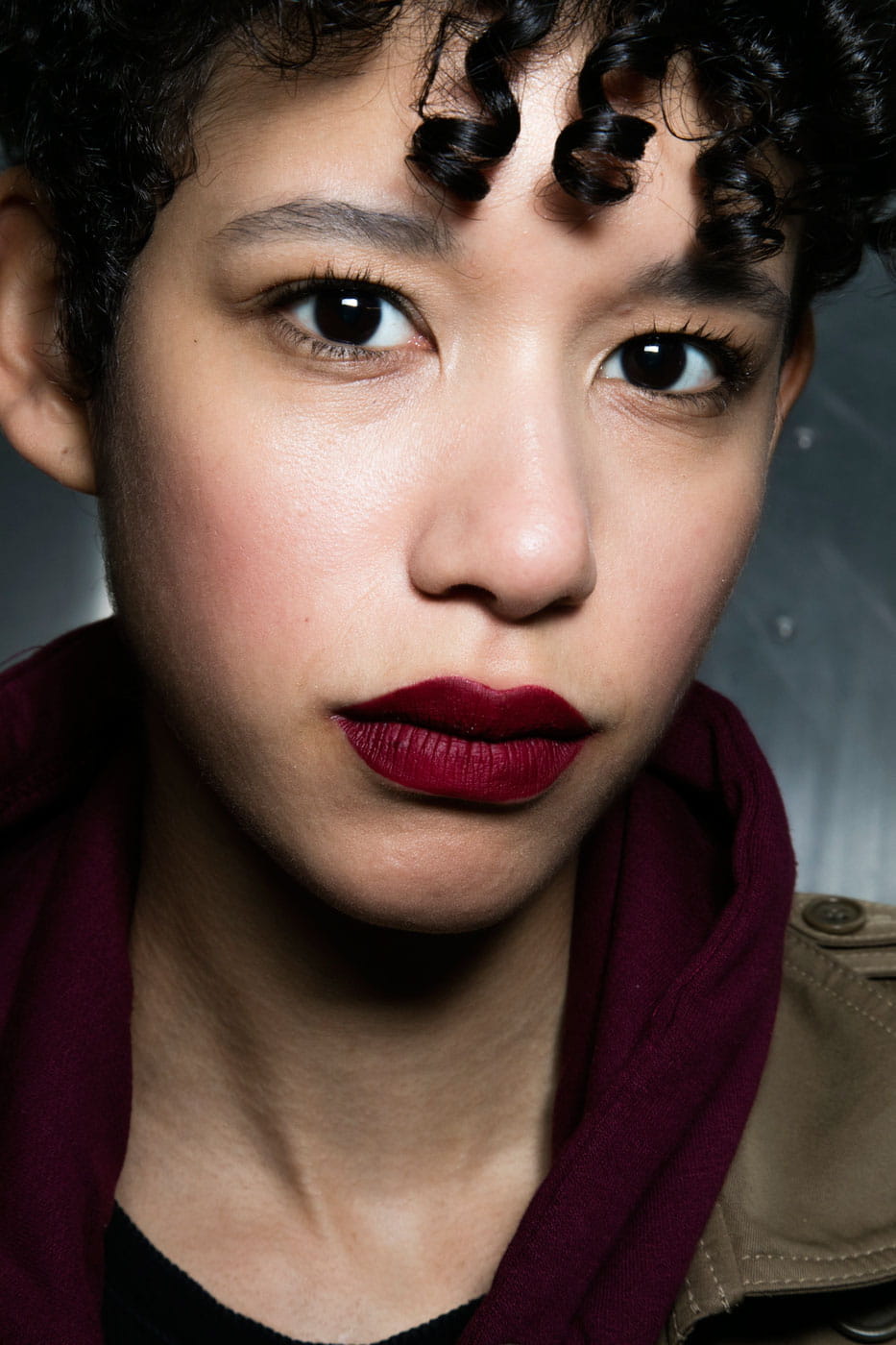 La bouche rouge s'intensifie avec un bordeaux profond et mate. Pour l'accompagner, le teint est lumineux et les pommettes rosissent sous l'effet d'un blush.