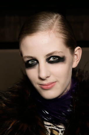 Dries Van Noten joue la carte de l'ultra noir. En halo, autour des yeux, un fard black mat s'impose sans demi-mesure pour un regard inquiétant presque dégoulinant.