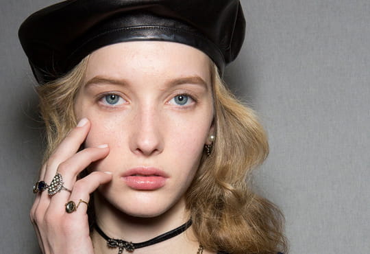 La femme Christian Dior de l'automne-hiver 2017-2018 a été dévoilée au Musée Rodin dans un décor illusionniste. Cette saison, Maria Grazia Chiuri, la styliste de la maison a souhaité rendre hommage à une couleur emblématique : le bleu. Sur le podium, les mannequins défilaient dans une symphonie de bleu pour nous plonger dans un océan d'élégance, mais pas que... Des robes en tulle côtoyaient des combinaisons en jean à l'inspiration workwear tandis que le béret ornait toutes les têtes pour un retour tout à fait réussi. Du côté de la mise en beauté, une fois encore, on met en avant un look naturel à travers un maquillage discret, presque imperceptible. Ici, le nude est célébré avec classe. Le teint est parfait, il est unifié mais laisse transparaître un voile de lumière pour rayonner malgré une météo maussade. Le regard est subtilement rehaussé à l'aide d'un mascara et d'un trait extra fin d'eyeliner qui va intensifier la frange des cils. Les sourcils sont coiffés et étoffés pour apporter un maximum de dimension. Les lèvres pulpeuses s'affirment tout en gourmandise grâce à l'application d'un baume coloré. Le nude nous suit jusqu'aux ongles, portés courts. Au programme : une manucure laiteuse à la pointe du raffinement. La chevelure se porte lâchée sous le béret brillant. D'abord bouclée au fer, elle est coiffée à l'aide d'une grosse brosse pour créer un effet wavy romantique et sophistiqué.